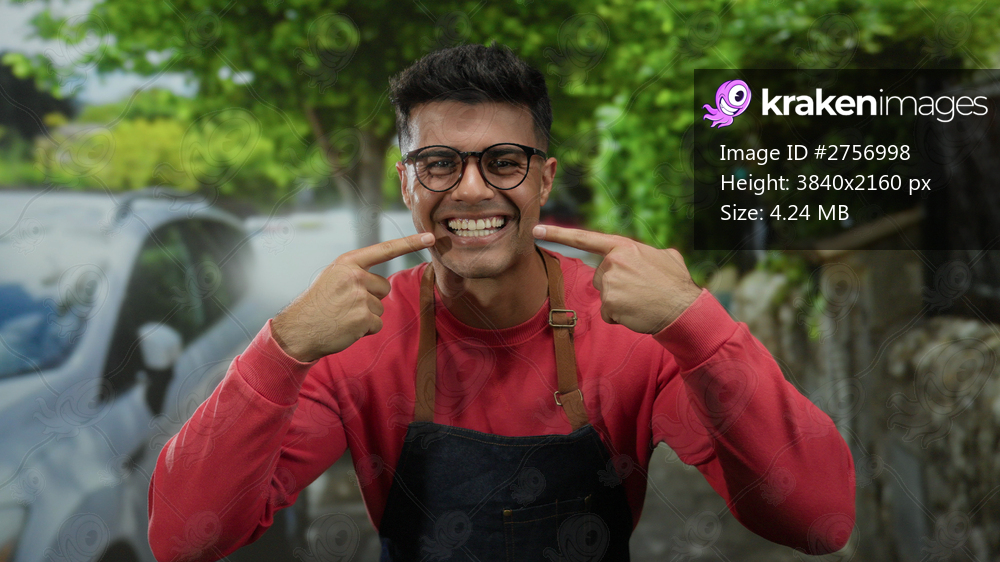 Young man smiles pointing at his teeth wearing glasses and apron standing in a vibrant outdoor city street setting with trees and cars in the background. - Kraken Images