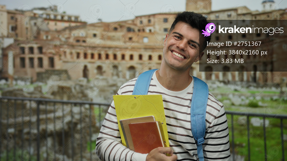 Young man smiling with a backpack and notebooks in front of ancient roman ruins outdoors in the city, showcasing history and tourism in an urban setting. - Kraken Images