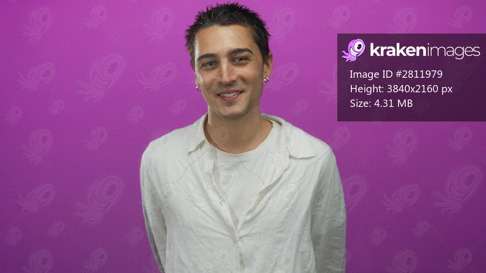 Young man smiling against an isolated pink background wearing a white shirt, portraying happiness and confidence in a vibrant and modern setting.
