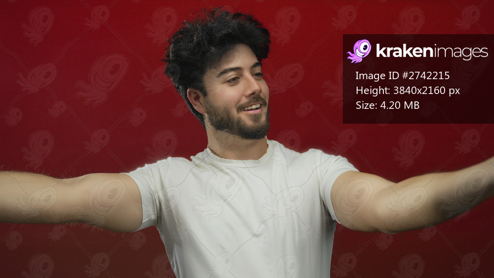 Young man smiling with arms open against a vibrant red background displaying a cheerful welcoming gesture with a beard and wearing a casual white t-shirt. - Kraken Images