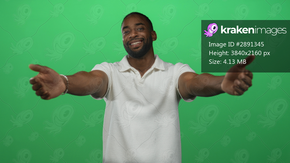 Young man smiling with arms outstretched and hands reaching toward camera in green studio setting; welcoming warmth.