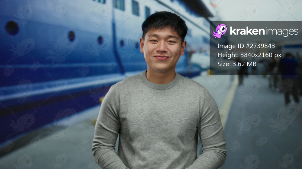 Young man smiling at seaside port with a boat in the background under a clear blue sky