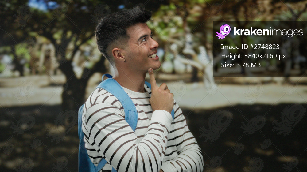 Young man smiling with backpack in outdoor park setting on sunny day.