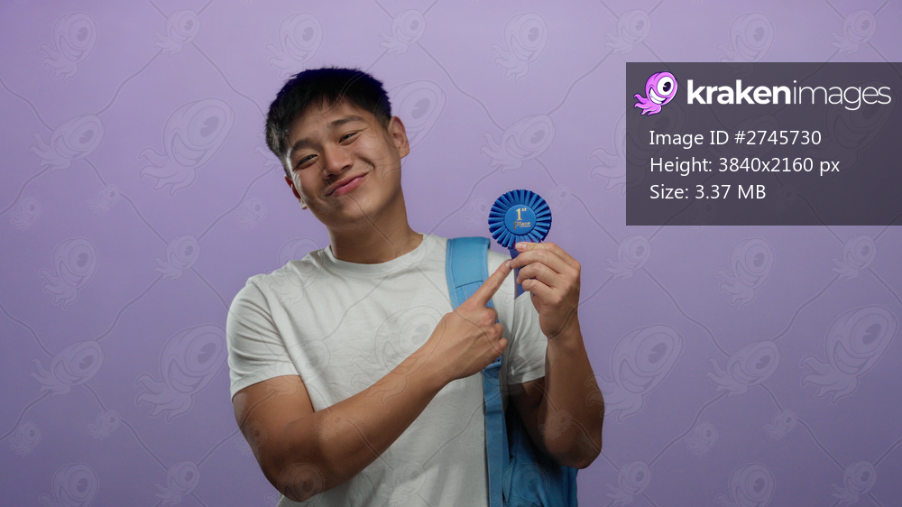 Young man smiling with blue backpack and first place ribbon against purple wall background suggesting achievement and student success