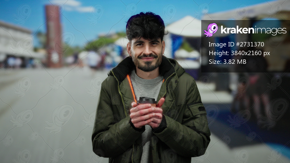 Young man smiling with coffee cup in hands standing at outdoor market street under a clear blue sky, wearing a green jacket, capturing a relaxed and happy moment in a vibrant urban setting. - Kraken Images