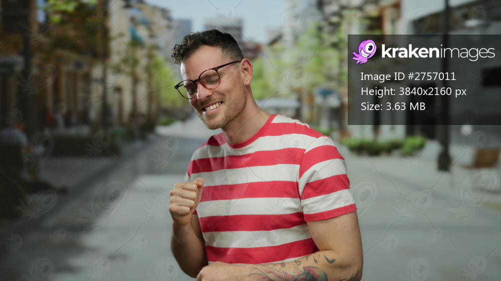 Young man smiling confidently on an urban street wearing a red and white striped shirt while giving two thumbs up.