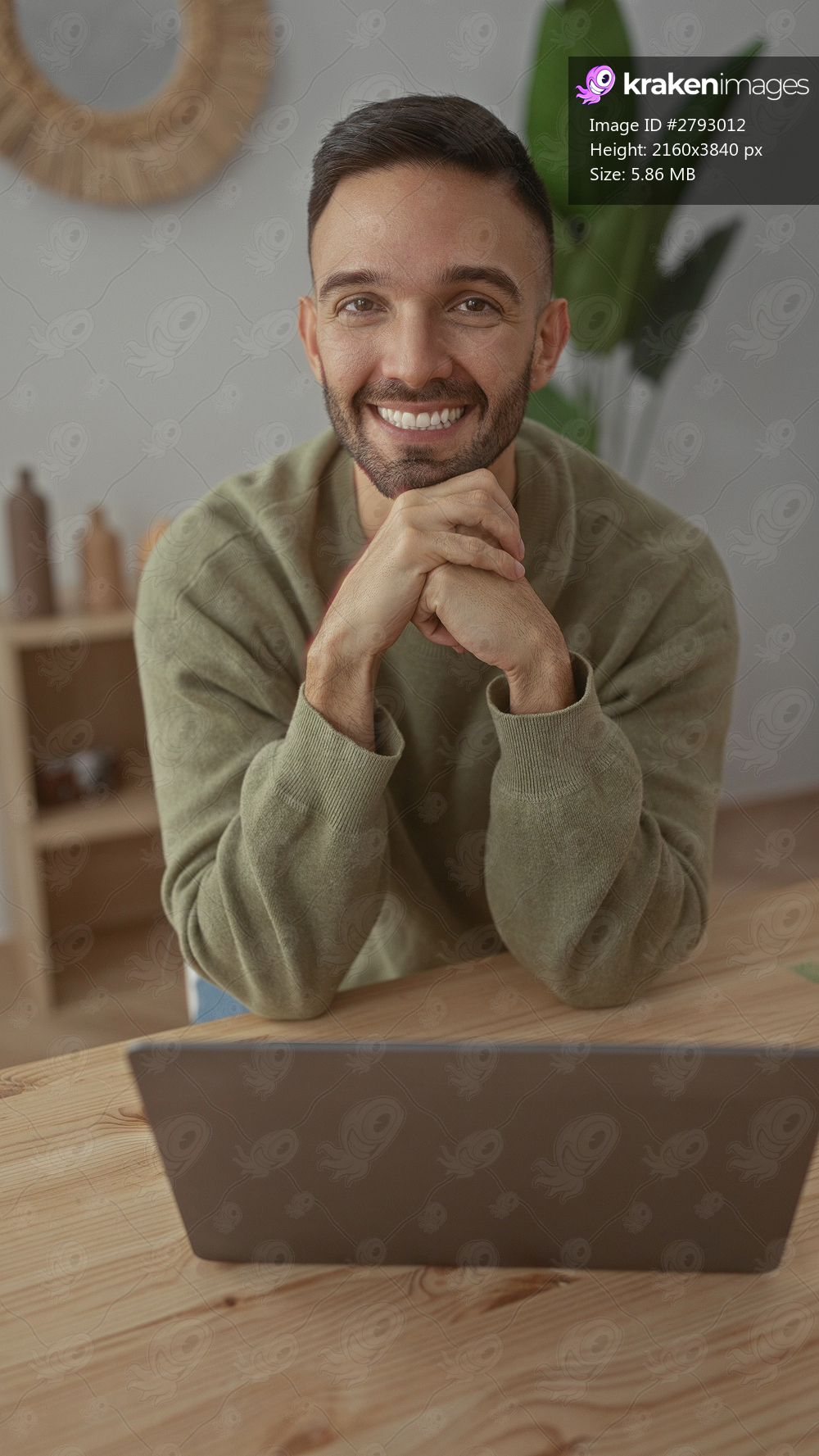 Young man smiling confidently while sitting in a cozy living room, working on a laptop, creates an inviting atmosphere, underscored by the warm, homey interior elements. - Kraken Images