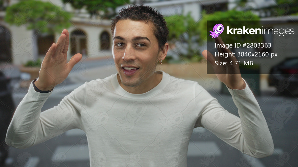 Young man smiling and gesturing in an urban street setting, wearing casual clothes with trees and buildings around, in a lively town atmosphere.