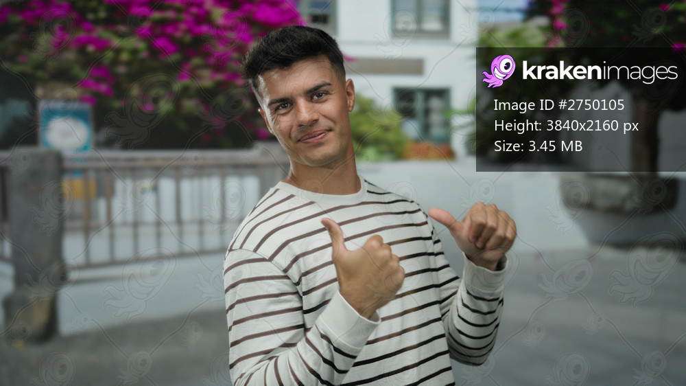 Young man smiling and gesturing thumbs up on a vibrant city street with floral background exuding joy and positivity outdoors during daytime captured mid shot. - Kraken Images