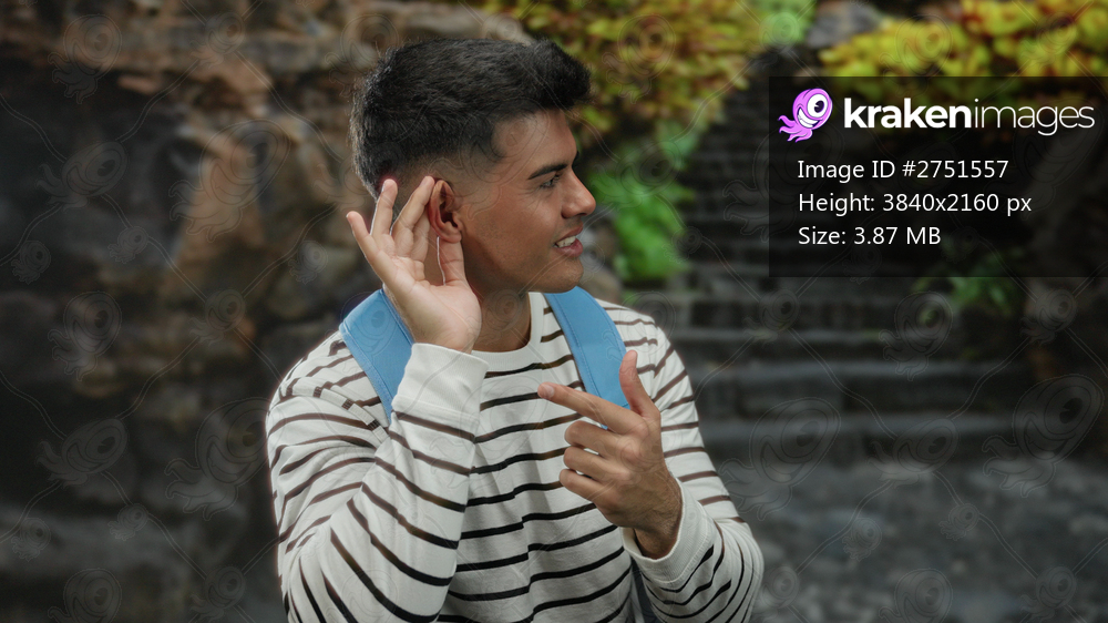 Young man smiling and gesturing to his ear outdoors, wearing striped shirt and backpack on city street with steps in background.