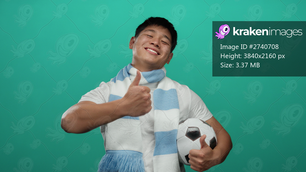 Young man smiling holding soccer ball wearing scarf showing thumbs up against green background suggesting positivity and sports enthusiasm