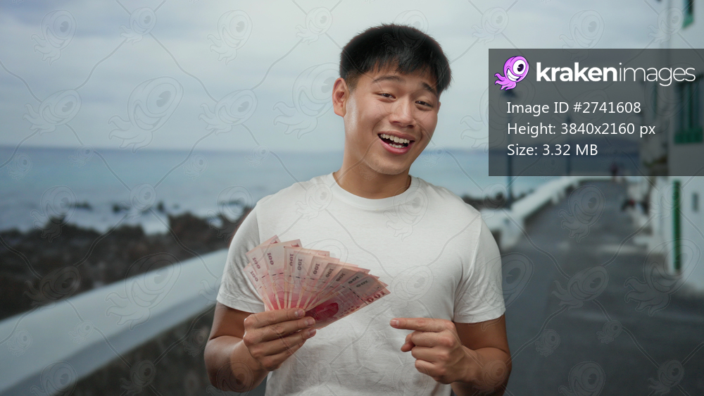 Young man smiling and holding taiwan dollars on a seaside promenade with an ocean view.