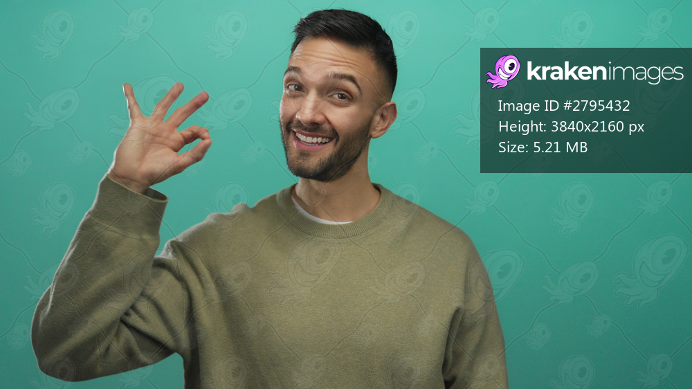 Young man smiling in a casual sweater gestures okay against a vibrant blue background conveying positivity and confidence.