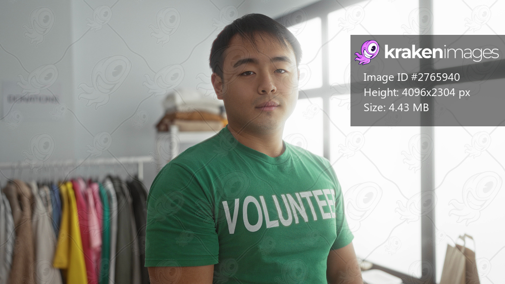 Young man smiling in a charity donation center while wearing a green volunteer shirt with clothing in the background, embodying community spirit and service. - Kraken Images