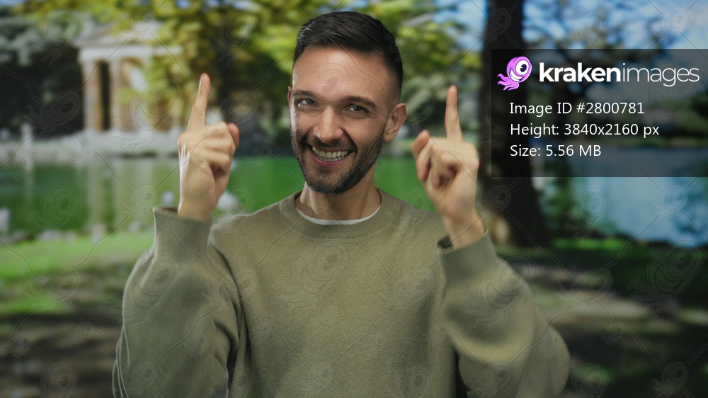 Young man smiling in a green park outdoors with trees and a lake, wearing a casual sweater while pointing upwards, enjoying the sunny day outside.