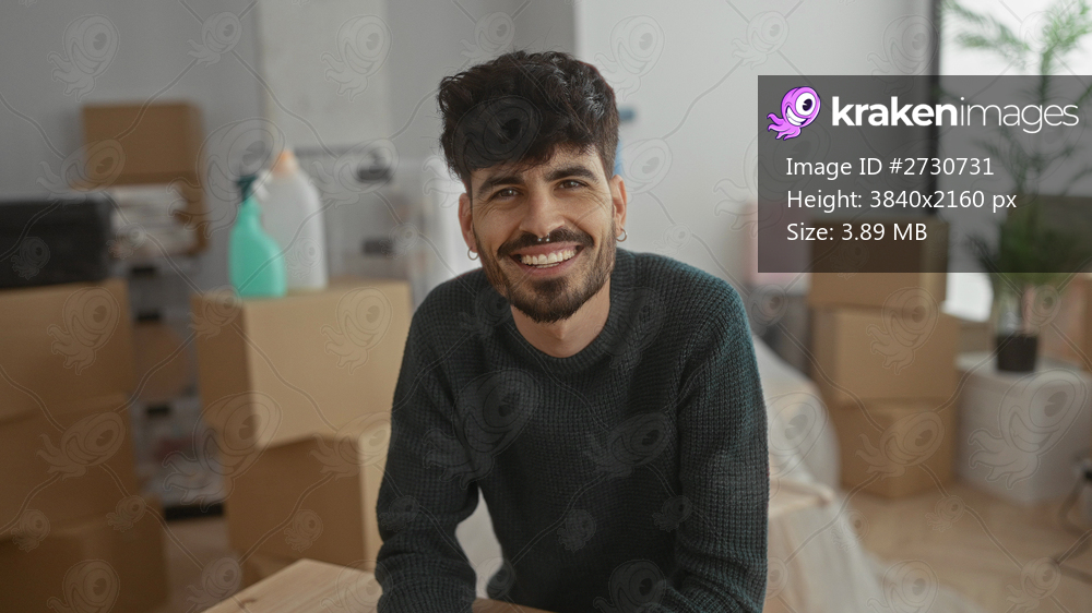 Young man smiling in a new home with many moving boxes scattered around the modern living room, showcasing the excitement and challenges of relocating and starting fresh indoors. - Kraken Images