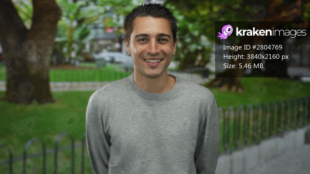 Young man smiling in a park setting with trees in the background, showcasing a casual look.