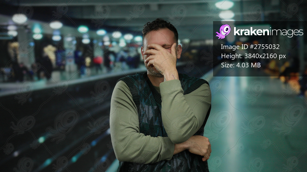 Young man smiling in a train station, showcasing a casual and friendly demeanor, with blurred lights in the background indicating movement and urban environment - Kraken Images