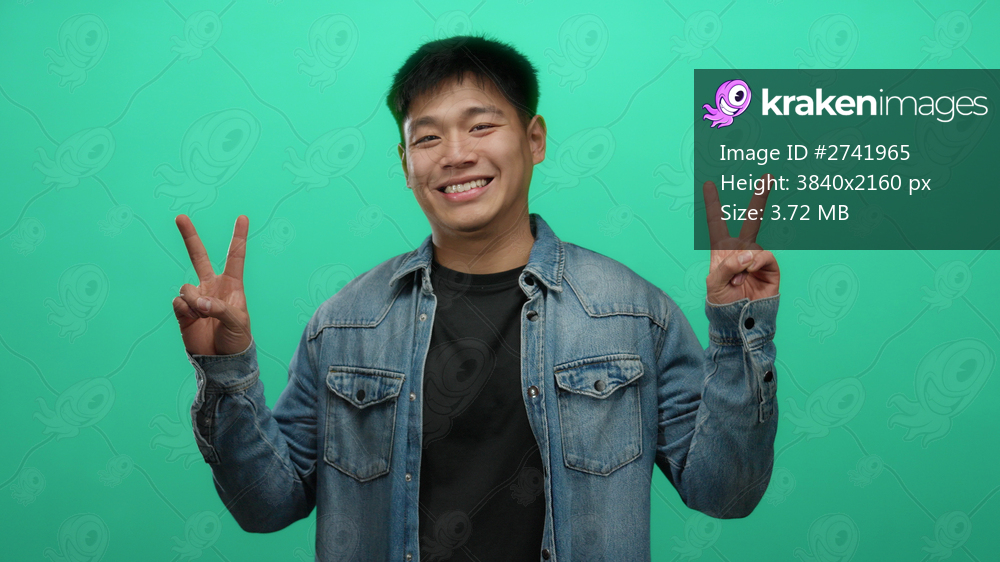Young man smiling in casual denim shirt making peace signs with both hands over vibrant green wall background
