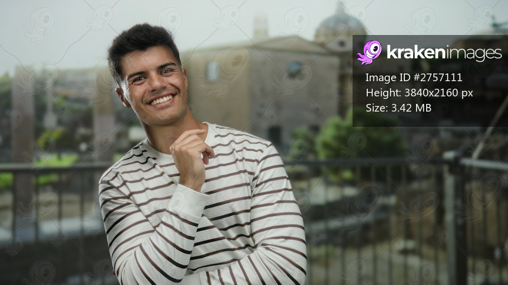 Young man smiling in front of ancient roman ruins, dressed in a striped shirt, with blurred cityscape and historic architecture in the background.