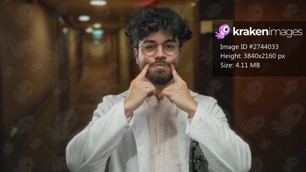 Young man smiling in hotel hallway, bearded and wearing glasses, depicting happiness and indoor fashion setting with hispanic cultural influence.