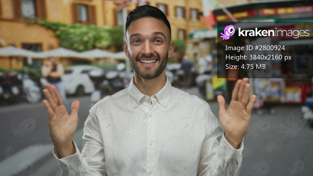 Young man smiling in urban street setting outdoors with cafes and shops, capturing vibrant city life.