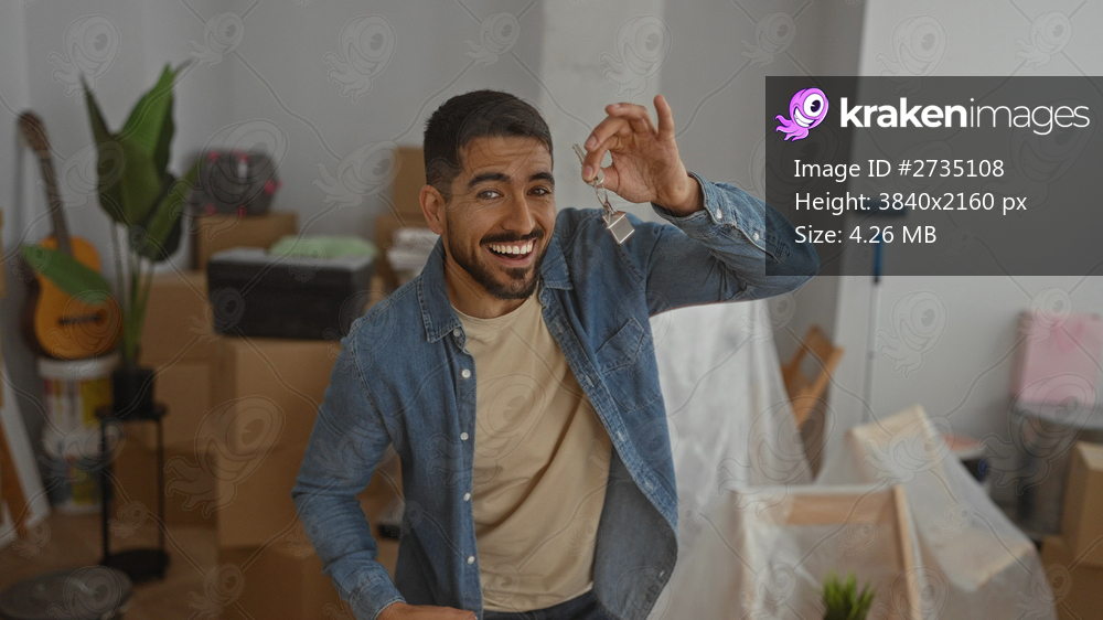 Young man smiling indoors in new home living room holding keys surrounded by moving boxes.