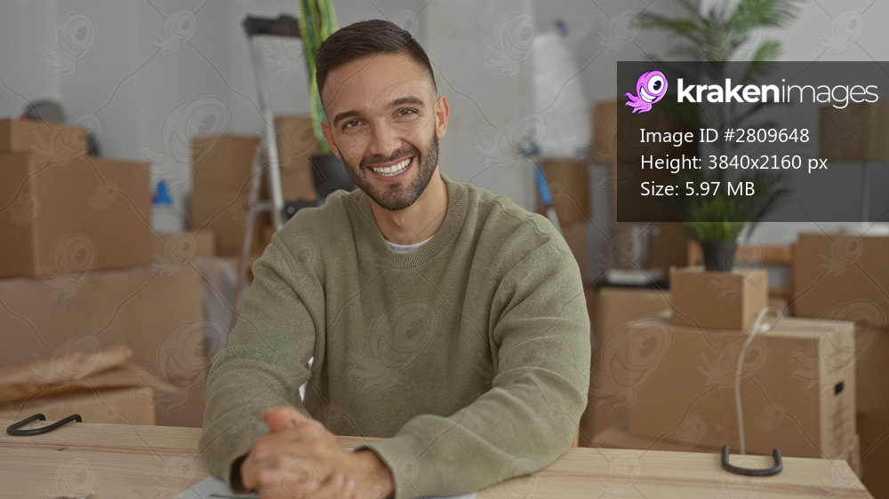 Young man smiling indoors with moving boxes in a new home surrounded by plants and furniture showcasing a fresh start in a relaxed environment.