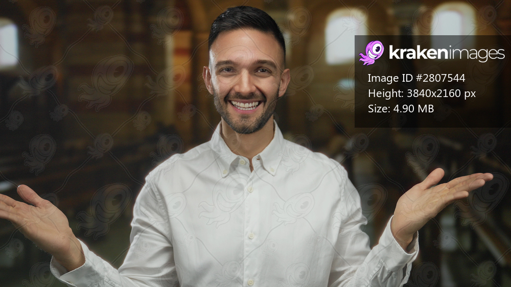 Young man smiling indoors with open arms inside a church setting, symbolizing faith and positivity, illuminated by warm light suggesting a spiritual ambiance. - Kraken Images
