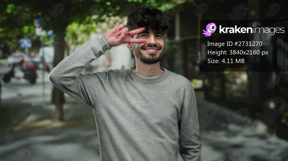 Young man smiling and making a peace sign outdoors on a sunny urban street under the shade of trees, dressed casually in a grey sweatshirt, portraying a relaxed and confident demeanor. - Kraken Images