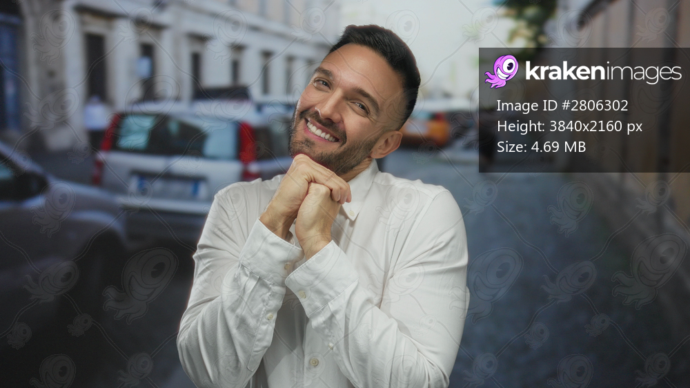 Young man smiling on a bustling city street, capturing the lively essence of urban life in an outdoor setting with parked cars lining the urban scene in a vibrant neighborhood. - Kraken Images