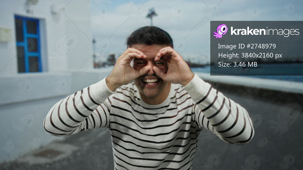 Young man smiling on a seaside promenade wearing a striped shirt with a joyful expression, surrounded by a scenic seascape.