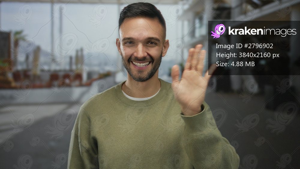 Young man smiling on a sunny city street with a welcoming gesture and modern architecture backdrop, capturing urban lifestyle and friendly interaction. - Kraken Images