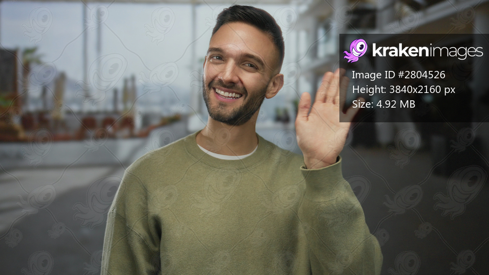 Young man smiling on a sunny city street with a welcoming gesture and modern architecture backdrop, capturing urban lifestyle and friendly interaction. - Kraken Images
