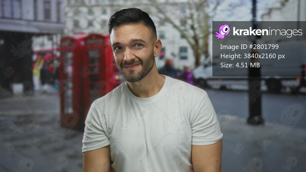 Young man smiling on an urban street with red telephone boxes and vehicles in the background creating a lively cityscape ambiance.