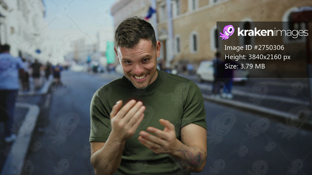 Young man smiling on urban street with people and cars in background, showcasing a lively city atmosphere