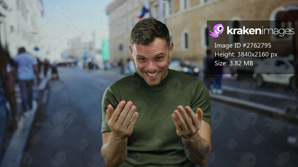 Young man smiling on urban street with people and cars in background, showcasing a lively city atmosphere