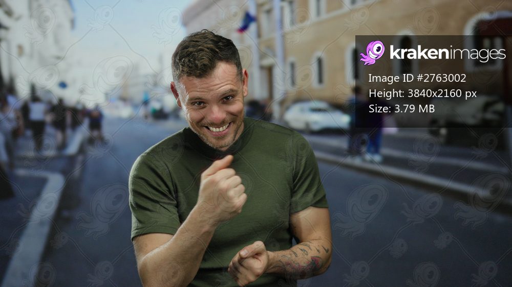 Young man smiling on urban street with people and cars in background, showcasing a lively city atmosphere
