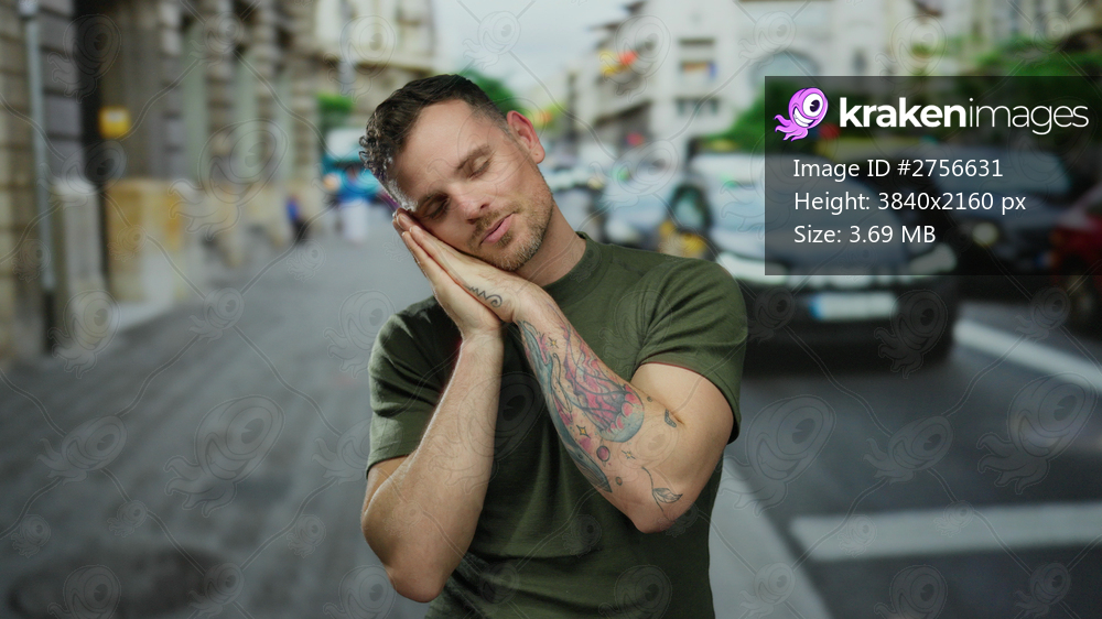 Young man smiling on urban street with tattooed arm and relaxed pose, demonstrating happiness and stretching gestures, captured outdoors in a vibrant city environment. - Kraken Images