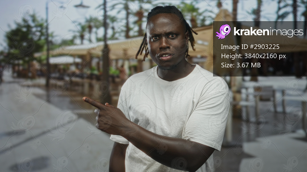 Young man smiling with open hands, white shirt and dreadlocks on a street terrace restaurant outdoors; joy connection.