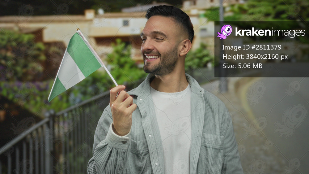Young man smiling outdoors holding nigeria flag on urban city street expressing happiness with vibrant backdrop.