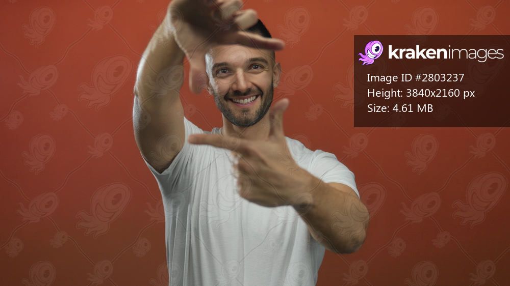 Young man smiling with outstretched arms against vibrant orange background capturing a creative gesture with enthusiasm and positivity.
