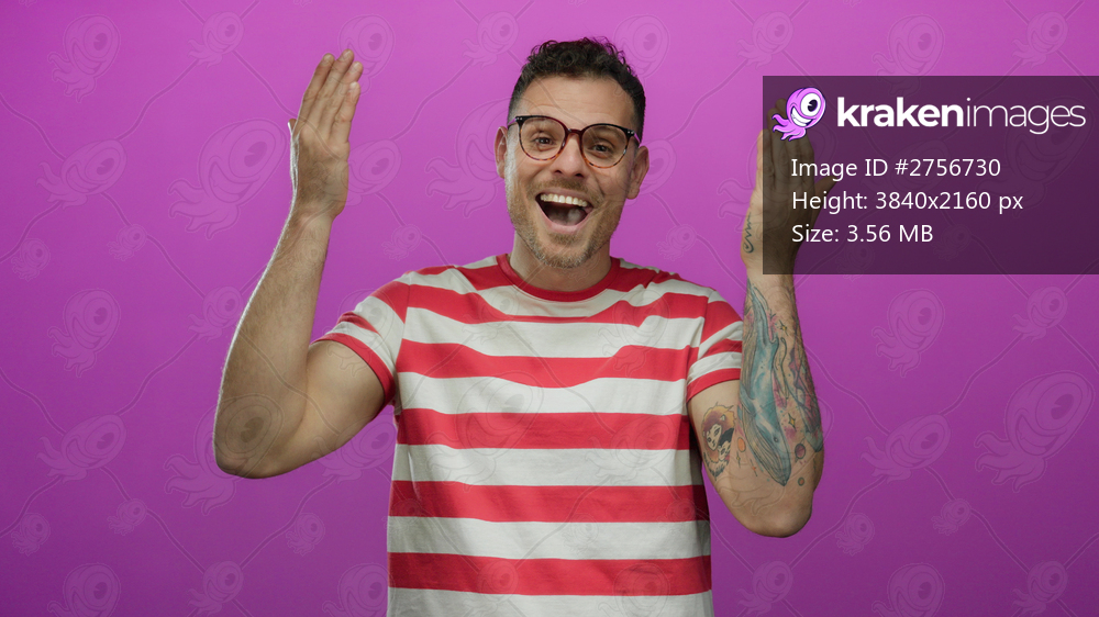 Young man smiling playfully with hands up against isolated pink background wearing striped shirt and glasses