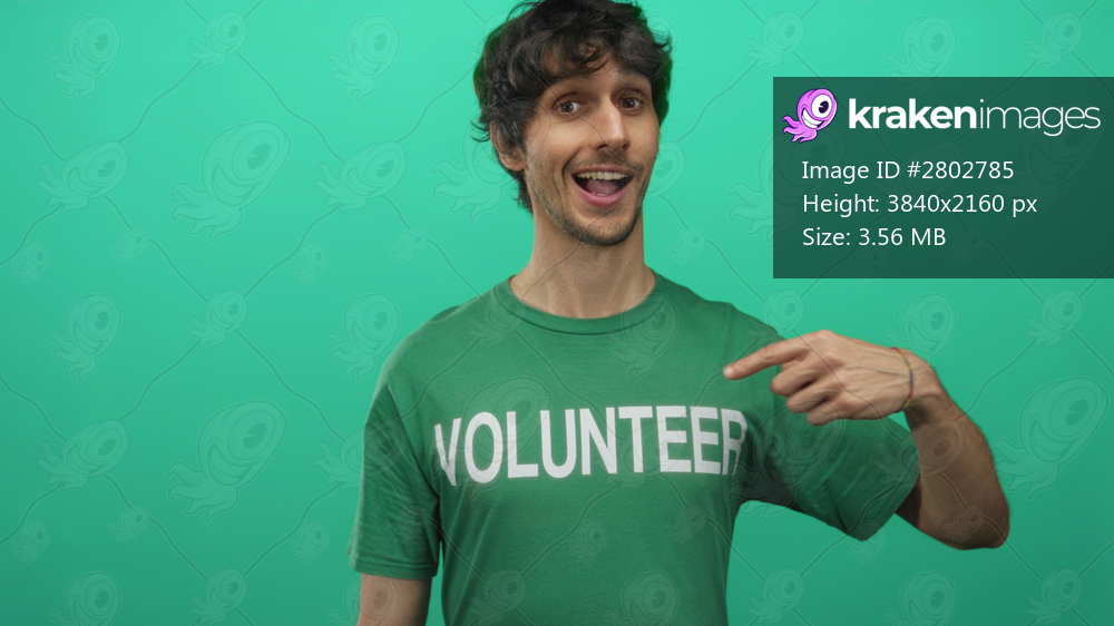 Young man smiling and pointing at volunteer shirt in studio while giving thumbs up and wearing green tee; support.
