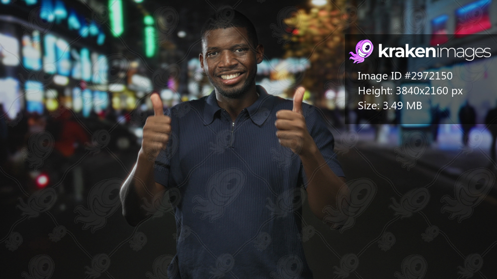 Young man smiling, pointing finger and giving thumbs up on a nighttime city street; confidence celebration.