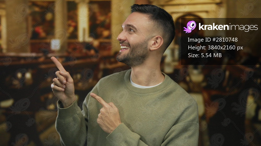 Young man smiling and pointing indoors in a church setting conveying faith and positive emotion through a serene and contemplative atmosphere.