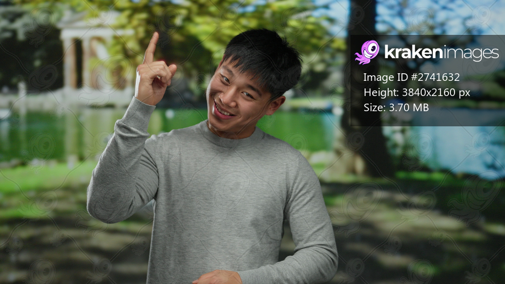 Young man smiling and pointing, standing in a lush outdoor park setting with vibrant greenery and trees, conveying happiness and positivity.