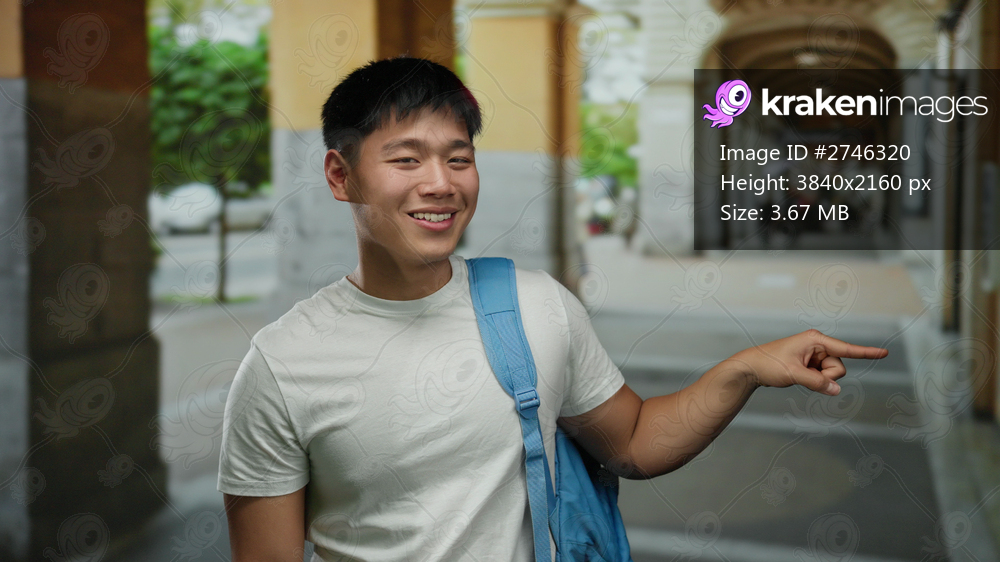 Young man smiling and pointing while standing outdoors in a city street with a blue backpack, showcasing a vibrant and urban lifestyle.