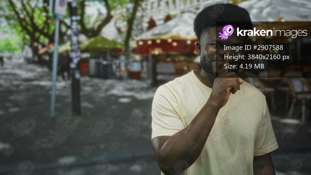 Young man smiling points finger and finger to lips for silence while standing near outdoor cafe on a city street; playful secrecy.
