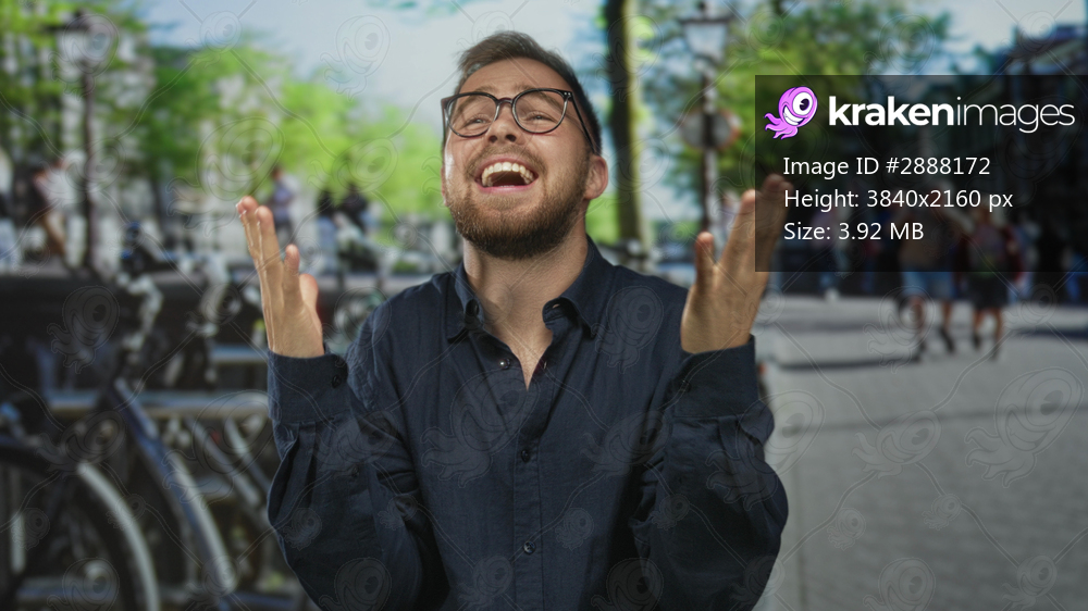 Young man smiling with raised clenched fists on amsterdam street by bicycle racks and canal path; triumph celebration.